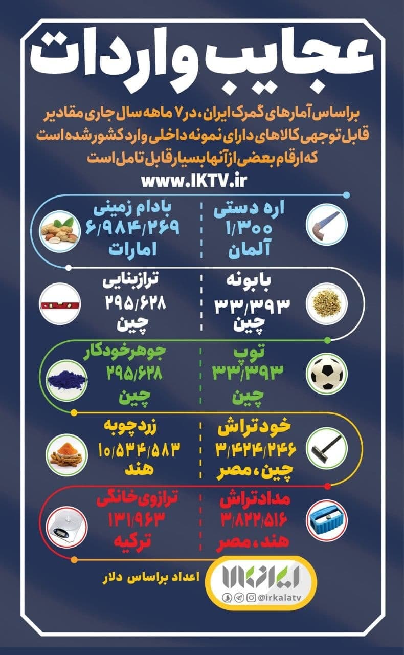 براساس آمارهای گمرک ایران، در ۷ ماهه سال جاری مقادیر قابلتوجهی کالاهای دارای نمونه داخلی وارد کشور شده است که ارقام بعضی از آنها بسیار قابلتامل است.